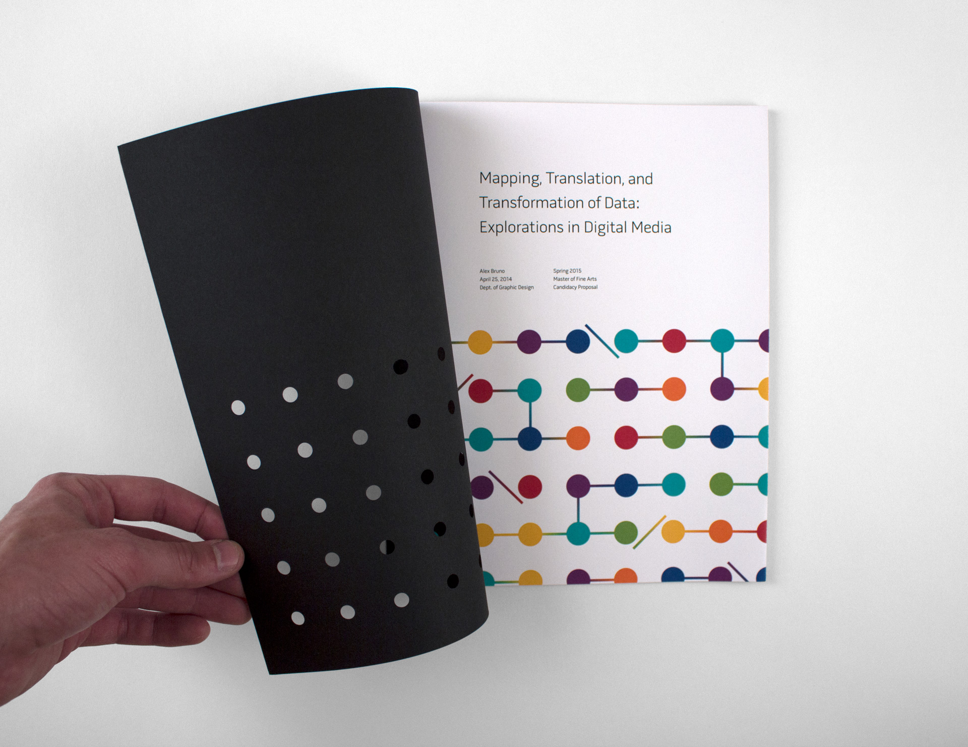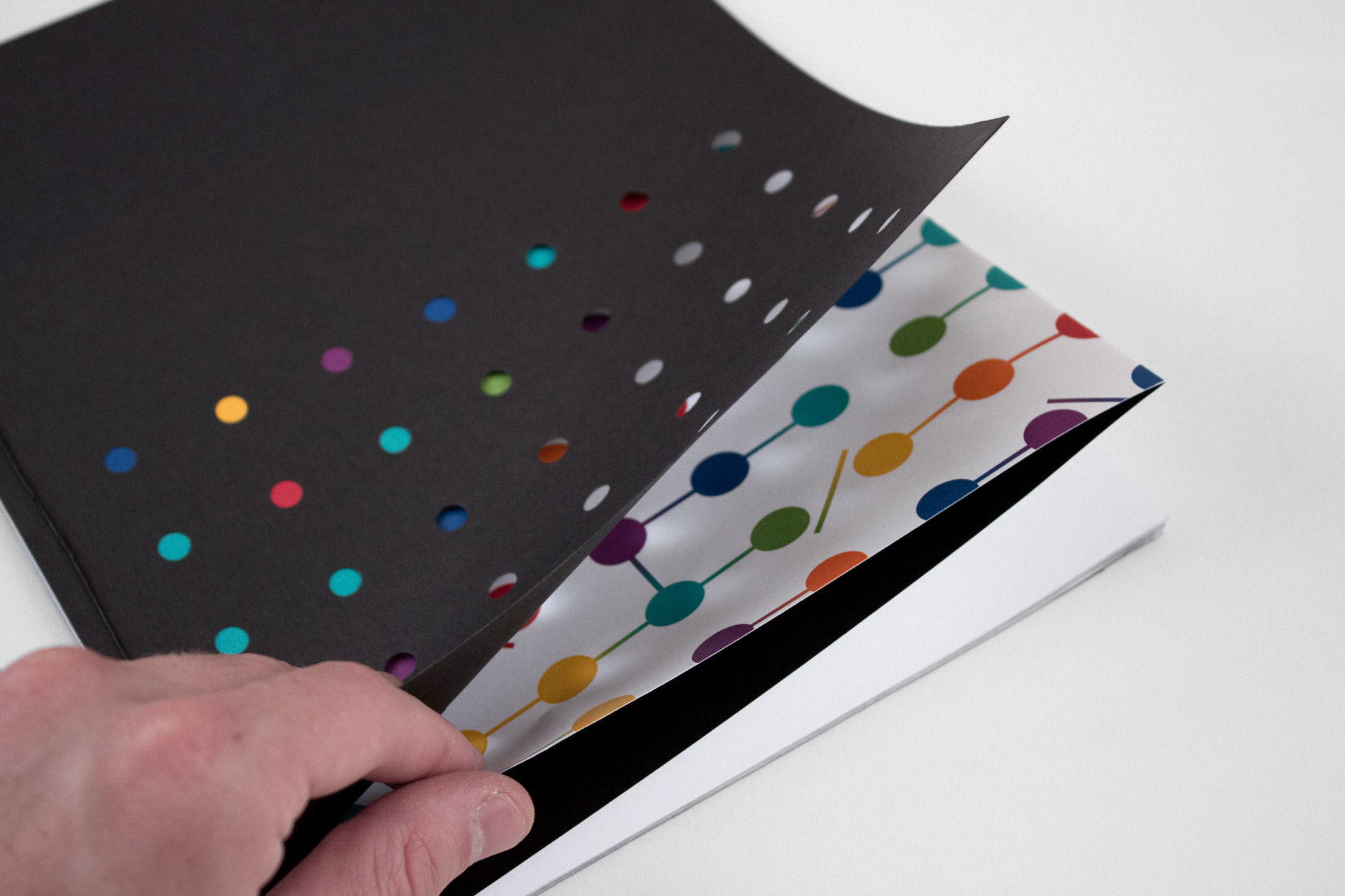 The book was hand-assembled with die-cut holes on the front cover. Each spread consisted of a French fold with rich black floods concealed on the reverse, and Japanese-style binding with black thread.