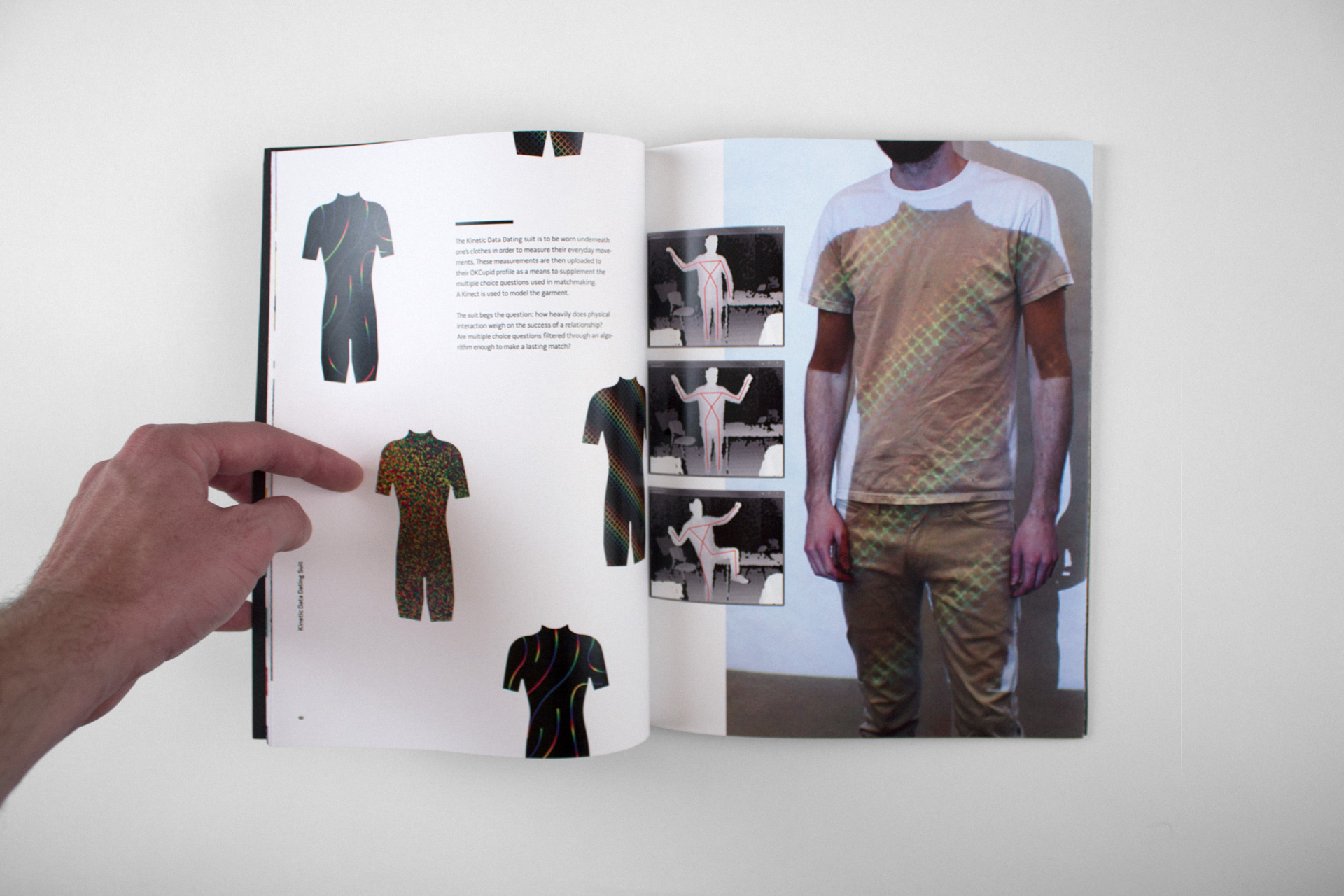 One project included was a concept for a body suit which captured biometric data from the wearer and sent this data to a dating site. This was meant to increase the accuracy of matching potential couples. Other projects included were Letter Head and Feedback.